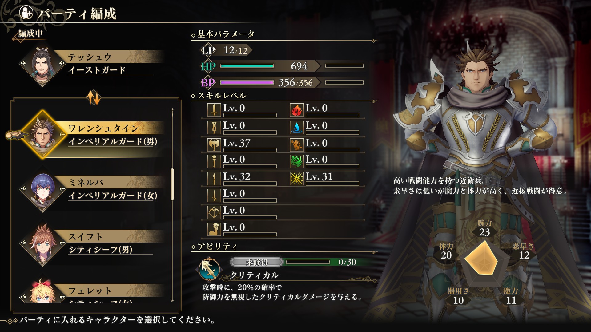 男インペリアルガードのワレンシュタインは腕力23、体力20の前線派。腕力を活かすために適正の高い斧を使うのが無難です。アビリティは攻撃時20%の確率で防御無視のダメージを与える強力なものです。女のミネルバは男に比べて魔力が高めに設定されています。とはいえ、17と術で戦うには少し心もとないので、剣か槍を使うのが無難です。こちらのアビリティはダメージカットとなっています。スクショしたら、なぜかミネルバさんが消えていました