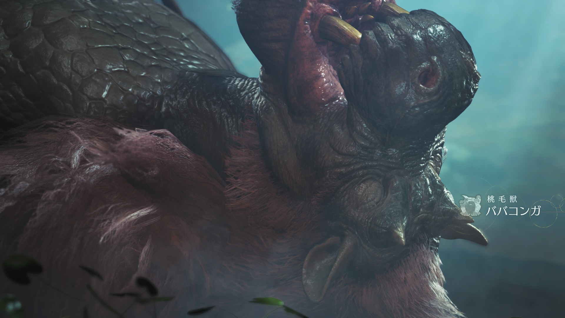 モンスターポータブル2以来の登場となるでしょうか。桃毛獣ババコンガです。なぜこんなにも封印されていたのか謎のモンスターです。排泄物を投げてきたり、食べたキノコに応じたブレスなどで攻撃してきます。属性は火と氷が効きます。また、各種状態異常も効きやすいモンスターです。頭部を破壊することで極彩色の毛を入手することが出来ます。久しぶりのババコンガなのでたくさん狩猟したいと思います