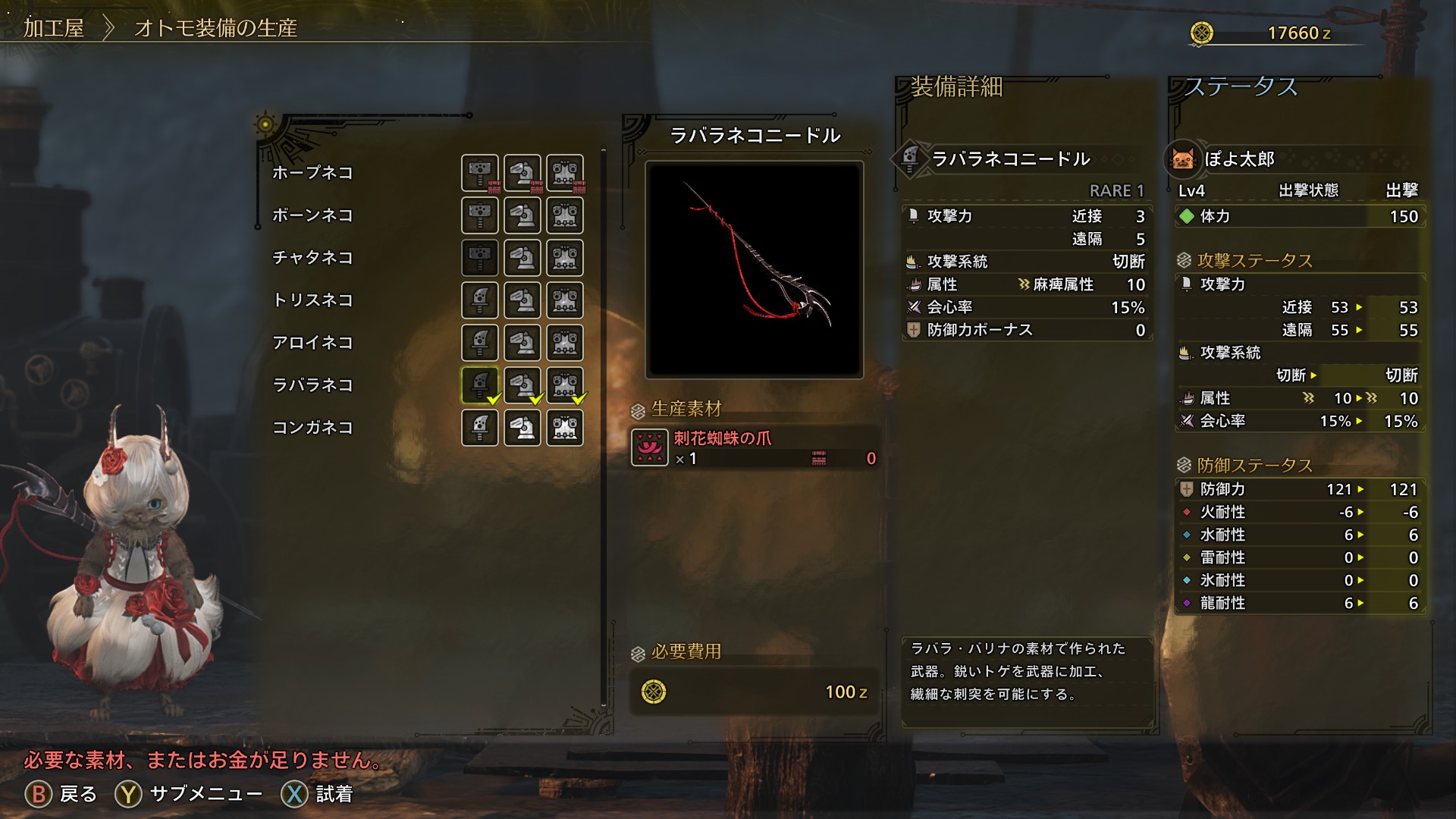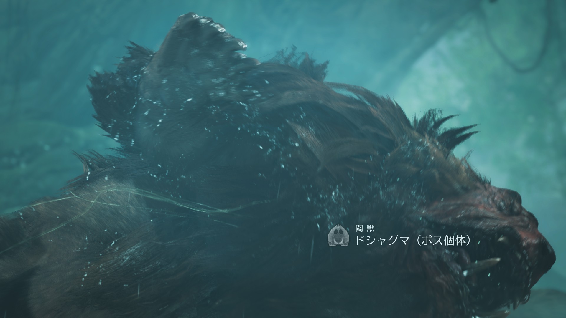 最初の難関モンスターだと思われるドシャグマです。モンスターハンターシリーズに慣れている人は問題なく討伐できると思いますが、ドシャグマはここまで登場したモンスターの中では群を抜いて攻撃力が高いです。防御力が低かったり、体力を上げていないと2撃で倒されることもあります。ドシャグマは火属性と雷属性が弱点となっていますが、火属性の方が効くのでケマトリスの武器を作っているのであればそれを持って行きましょう。作成できる装備品は、うん…まあ…と言った感じで正直微妙です