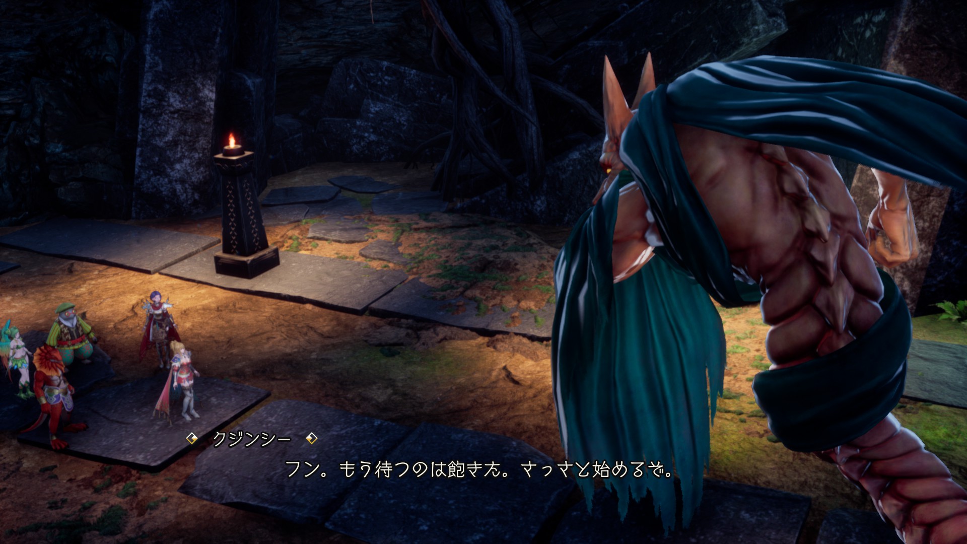 恐妃の都を進んで行くと、変化前の七英雄と戦闘が出来る部屋があります。まずは圧倒的に弱いと思われるクジンシーと戦ってみます。出現した時の台詞がもう弱そうなんだよなぁ~…。七英雄は5ターン以内に撃破することでそれぞれの特徴を持った装備品を入手できます。どれも非常に強力な装備品なので必ず入手しておきましょう。5ターン以内撃破のためには、オーバードライブゲージを満タンまで溜めてから戦闘するようにするとダメージが稼げるので良いです。