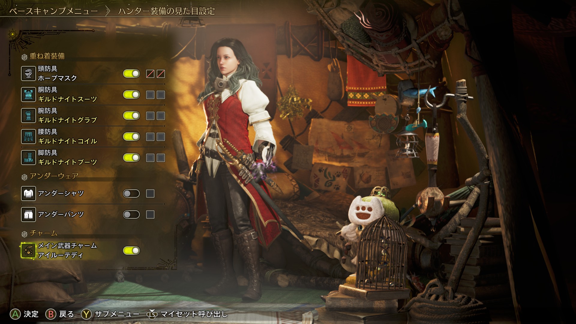 ワイルズにはアイスボーンに引き続き重ね着の機能があります。しかも、表示非表示の設定を部位ごとにできるので、キャラメイクを頑張ったので顔は出したいということであれば頭装備を非表示にすることが可能です。予約特典でギルドナイトスーツ一式をもらったので、早速着てみました。良い感じなのですが、腰の剣が謎の物理法則を始めることが分かったので微妙にオススメ出来ません。ワイルズのアイルーは日本語とアイルー語どちらかを設定することが出来ます。日本語って違和感あるかなと思ったのですが、思いの外しっくりくるので日本語設定から変更していません。ワイルズのアイルーは個性が凄くあって、今までで一番可愛いと思いました