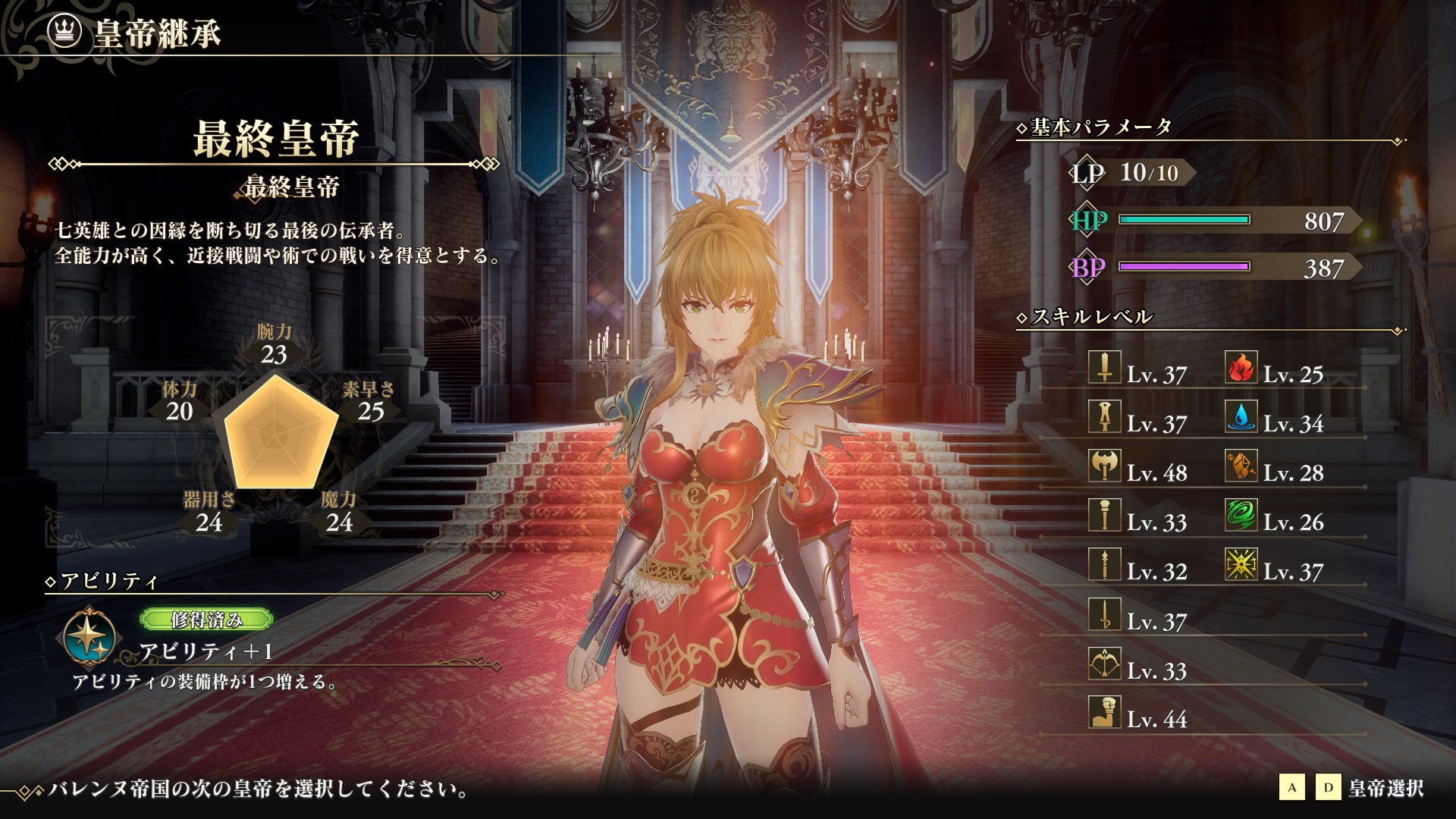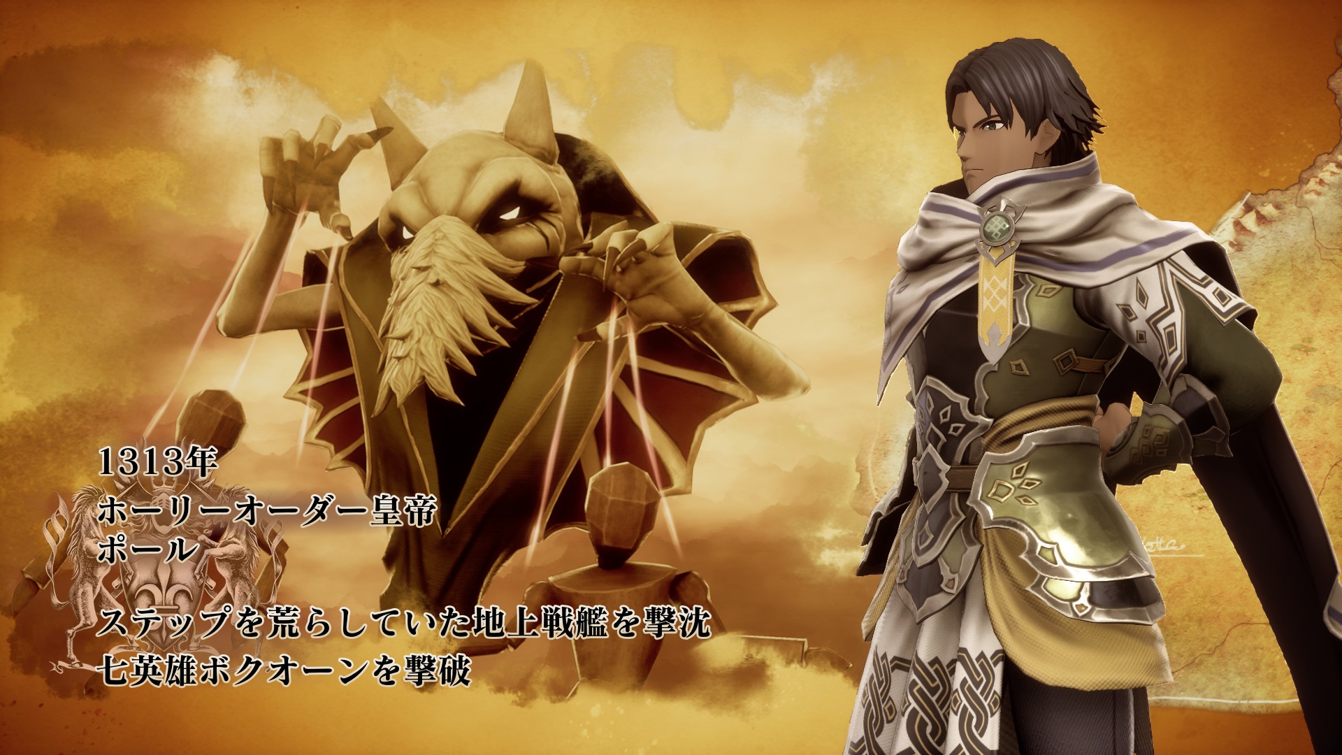 全てはこの初代皇帝レオンから物語は始まりました。レオンの次男ジェラールが伝承法によりソウルスティールを見切ってクジンシーを撃破。3代目皇帝はメンツを潰された格闘皇帝カール。宝石鉱山を解放して帝国の収入を増やしました。更にカンバーランドでトーマの後見となり、サイフリートの反乱を阻止しました。4代目皇帝ホーリーオーダーアガタの時に2体目の七英雄ダンターグを撃破しました。自分の選択した行動によってエンディングが変わるこのシステム本当に良いと思います。