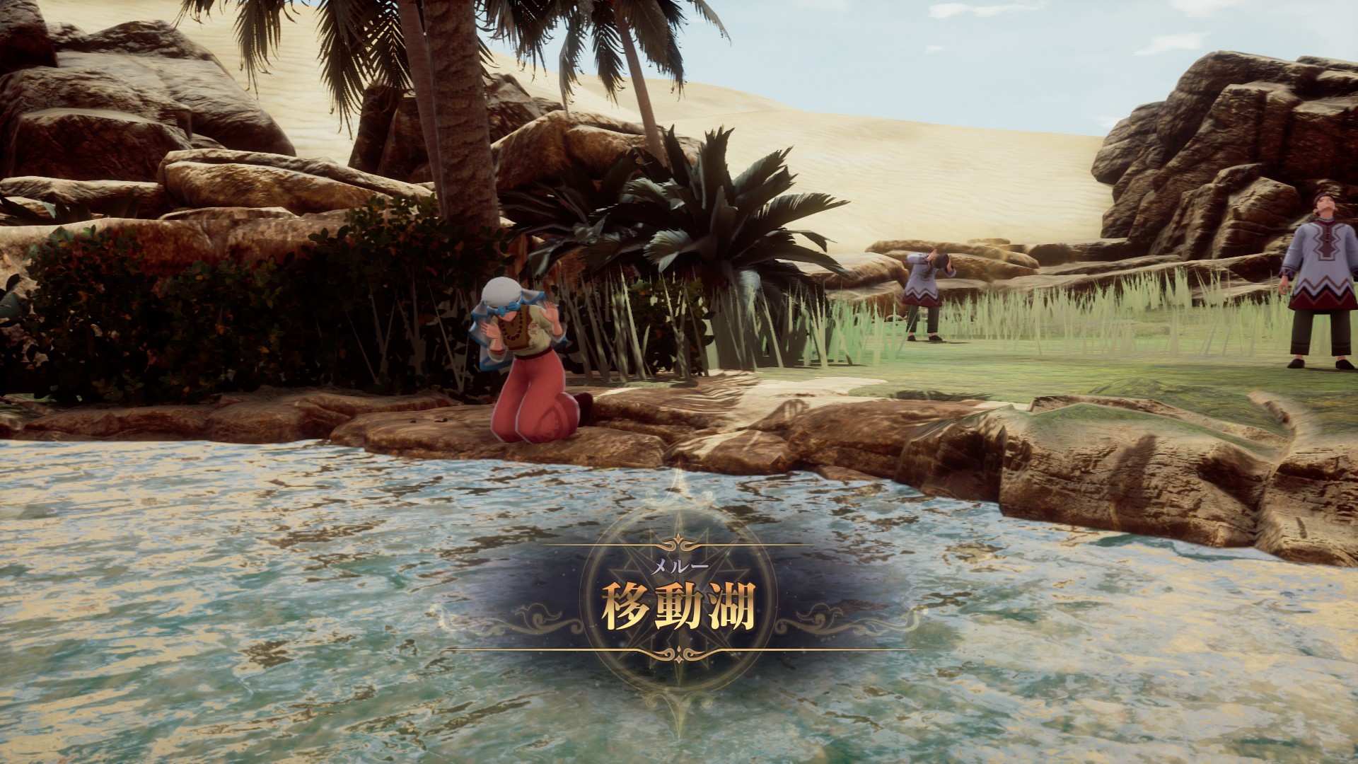 完了していなかったイベントもあるので、メルーの移動湖に来ました。移動湖は砂漠でオアシスの蜃気楼を追うことで到着出来ます。移動湖には七英雄のひとりノエルの幼馴染であるサグザーがいます。サグザーはオアイーブと同じく古代人のひとりです。この時代に生きている2人も何かしらの秘術で長生きをしているのでしょうね。見た目も回想シーンの時と変わっていないですし。
