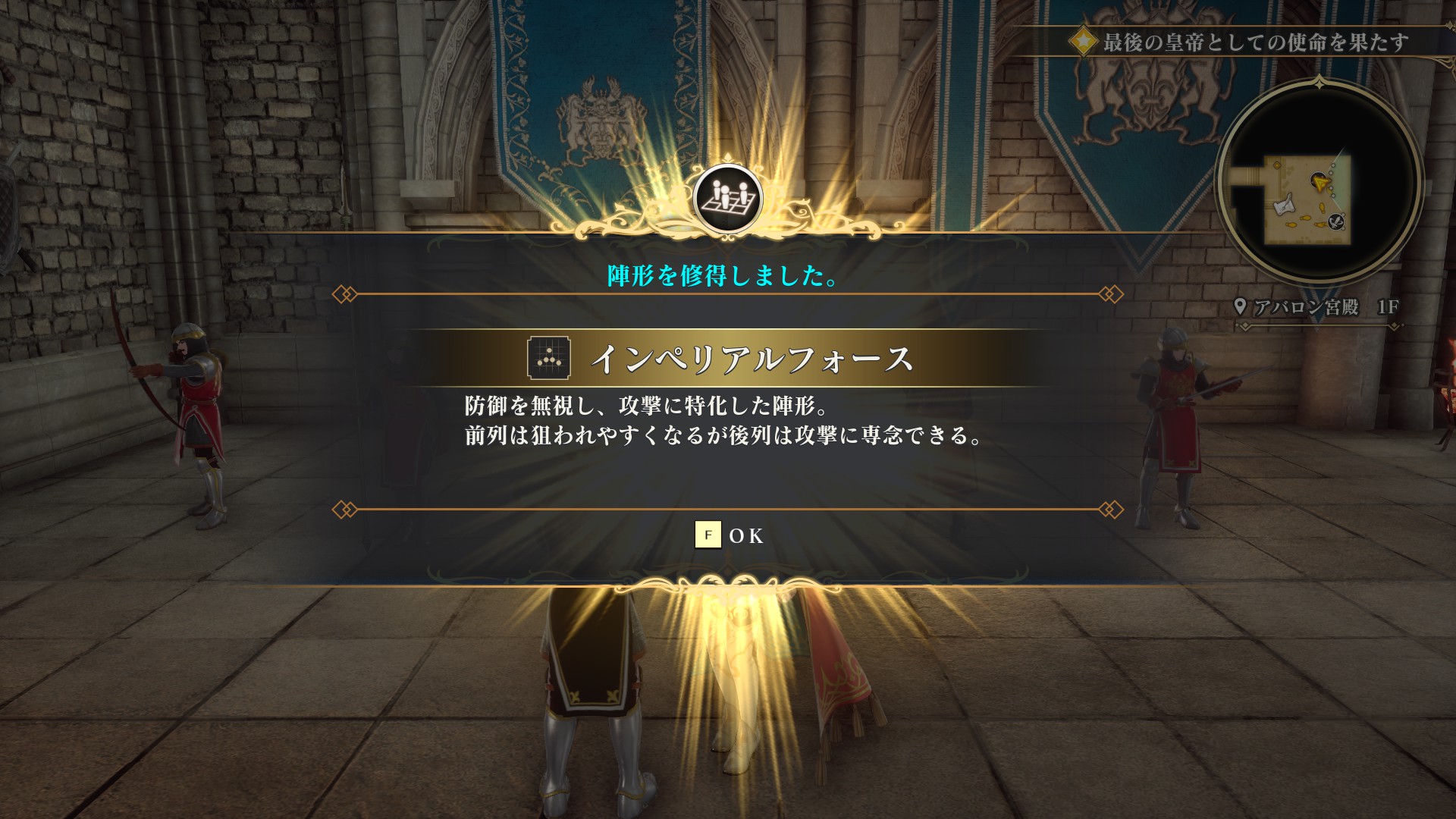 最終皇帝になるとインペリアルフォースという陣形を習得できます。一番最初に習得する陣形はインペリアルガードという防御系の陣形でしたが、こちらは攻撃型の陣形となっています。前線にタンクを置くことで攻撃力底上げできますが、縦攻撃に弱いのでそこには要注意です。ジェラールの時代にクリアしたゴブリンの穴に異変が起きているという報告を受けて行ってみると最奥で石像が動き出します。強力なボスかと思いきや…最終皇帝PTが強過ぎて圧勝でした。ちなみに、最終皇帝の登場によりクジンシーが再び復活をしています。