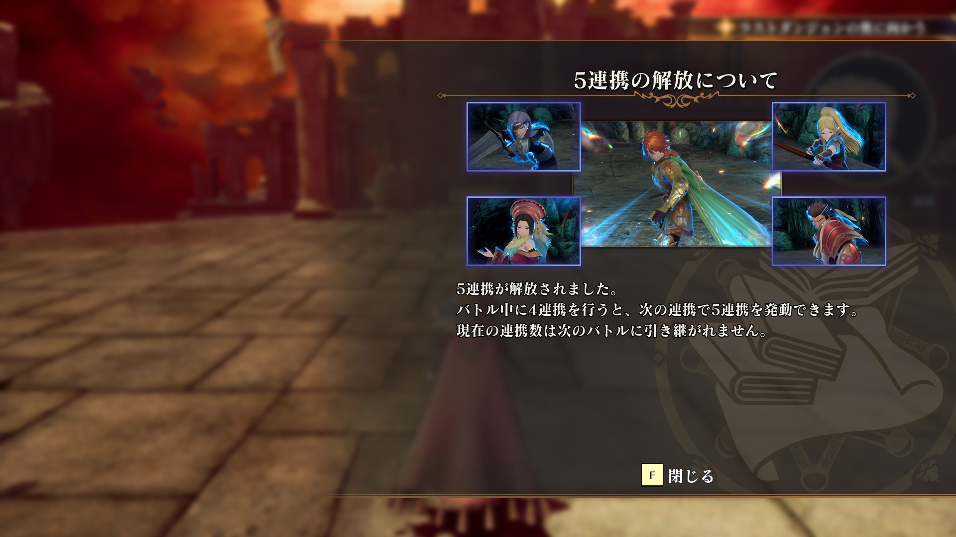 球体から全ての七英雄が現れ、最後のカットインが流れます。ここからが真のラストバトルです。原作で最高クラスの難易度と言われていた七英雄戦です。リベサガのラストバトルは、全体回復のレストレーションがあるにも関わらずかなり回復に気を遣わないとすぐに全滅します。七英雄の行動に合わせる必要がありますが、攻撃2、回復3くらいで対処が必要です。さて、最後は5連携で決めにいきます!これにて七英雄を撃破!エンドロールの鑑賞に入ります。