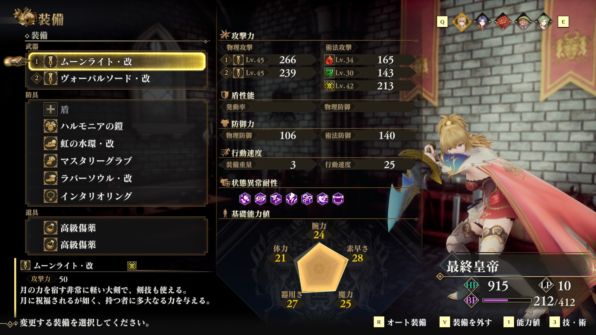 ラストダンジョンの途中で女最終皇帝の武器ムーンライトを強化できる素材をゲットし一度アバロンに戻りました。ムーンライト・改は大剣で月光という回復術まで使える超強力な武器です。ヴォーパルソード・改と比較しても攻撃力に27も差があります。ラストダンジョンに戻り、最深部で最終皇帝を待ち受けていたのは最後の七英雄であるノエル。ノエル以外を倒したのでノエルが待っていますが、ルート次第では当然待っている七英雄は異なります。ある程度道筋が決まっていながらも、ストーリーが変わるフリーシナリオは本当に面白いと思います。
