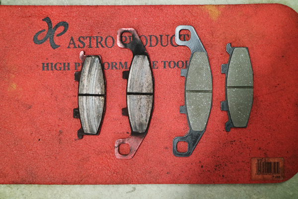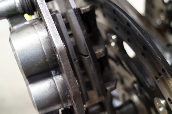 赤パッドの残量もまだあり、交換には早いようだがここは仕方ない。パッドを外してみたら、当たり面に筋が付いており、均一に当たっていない事が確認出来た。ピストンの飛び出し部分をパーツクリーナーで洗浄し、スライドピンの動きも確かめた。