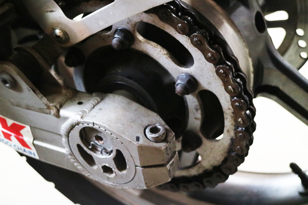 次は車体をホイストで吊って、チェーンの錆取りを行いオイルを注油、続いてチェーンの弛み調整のためスイングアーム後端のボルトを緩め右側の調整用の内六角にレンチを突っ込み左に回すとチェーンが張られる。毎回思うのだがこのエキセントリックカラー方式は秀逸である。簡単かつ正確にチェーンを張ることができるので、他のバイクにも是非採用して貰いたい機構である。