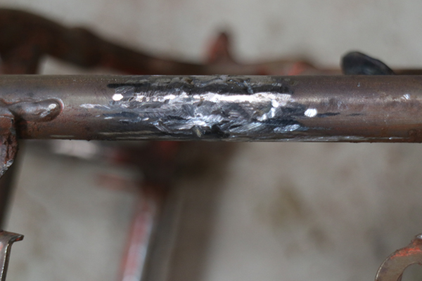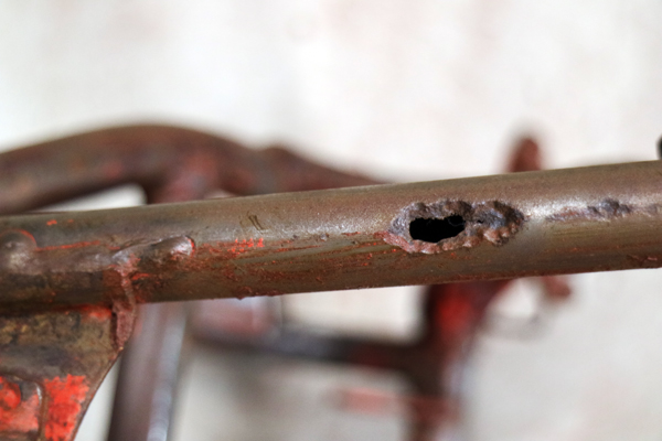 剥離をしていてフレームの上部右側中央辺りに、腐食と思われる穴が開いている事に気づいた。長さ1.5cm程度の穴なので、強度的には問題ないと思われるが、折角塗装するので直して置くことにした。