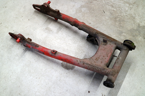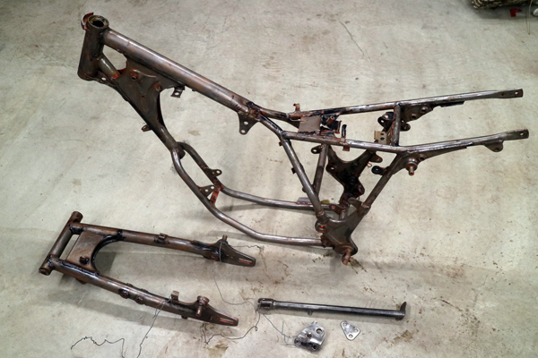 先ずは純正色の赤に塗られたフレーム、スイングアーム、サイドスタンド、エンジンハンガーから始めて行く。塗装の剥離方法は色々あるが、今回はディスクグラインダーにカップブラシを付けてガシガシ落として行く方式をとった。