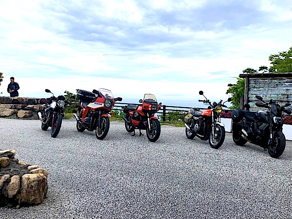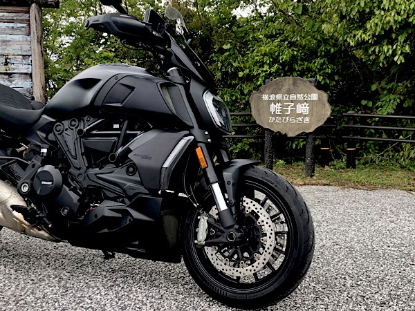 午後からは、宇佐大橋を渡って横浪黒潮ラインのコーナーを楽しみながら、帷子崎(かたびらざき)展望台でバイクを並べて記念撮影。この後も太平洋に迫り出す奇岩の絶景が連なるが、何時もの通り、先頭のディアベルは意に介せず止まってくれないので、絶景の写真が撮れない。