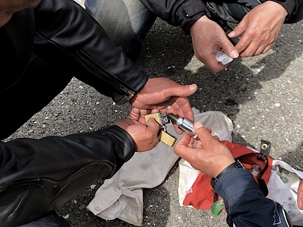 R194沿いのあいの里仁淀川に到着した頃には暑さがピークに達し、メータ内の温度計は27度に達していた。朝の天気と気温が嘘のような陽気である。休憩の後、たまらずジャケットのインナーを外して、出発しようとしたら、ルマンⅡのエンジンが掛からないトラブルが発生。中途半端な時間エンジンを止めると時々このような症状が出るようだ。しかし、オーナーは慣れたもので慌てる事無く、プラグを外し、Z2のジッポーを借りて電極を炙る。こういう時はヘッドが外に向いて飛び出したグッチの縦置きエンジンは整備性がすこぶる良い。プラグを外すのに邪魔な物は何もないのでチャチャチャと外して付けて、エンジン一発始動。時間が掛かると思いきや拍子抜けである。