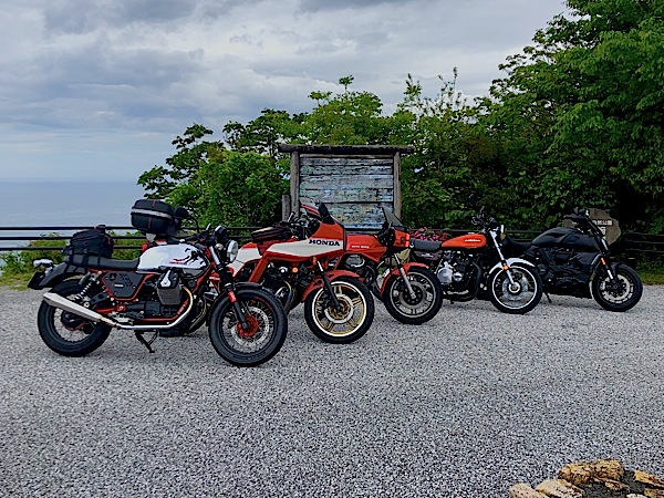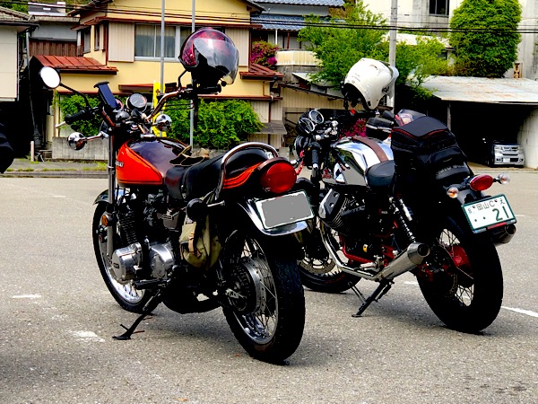 今回の参加車は県北からCB750ボルドール、Z2、県南からはディアベル、ルマンⅡ、V7が参戦、計5台での出陣だ。午前7時30分、GSにてV7の給油の帰りにどんより曇った空から雨が降り出し、折角磨いたバイクを濡らしてしまった。天気予報では曇りだった筈なのに何てこった。県北からの2台が気になる。LINEを見ても中止したとの連絡が無いので、きっと雨の中を走っているのだろうと気を揉む。