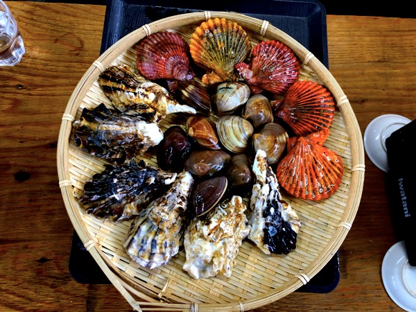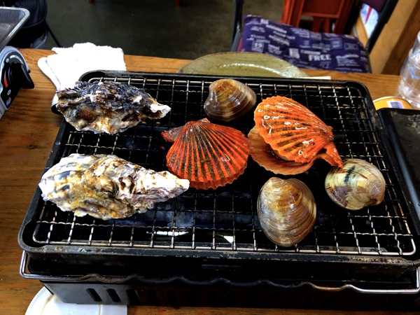 開店と同時に入店。客は我々5人だけだ。早速、、名物の貝セット(ヒオウギガイ、ハマグリ、カキ)を焼きながら、ビールや酒を飲み進めたい所だが、バイクの代行運転は無いので、フルーティーなノンアルビールで溜飲を下げる。初めて食べたヒオウギガイであったが、ホタテよりも味がシッカリしていて美味い。