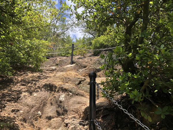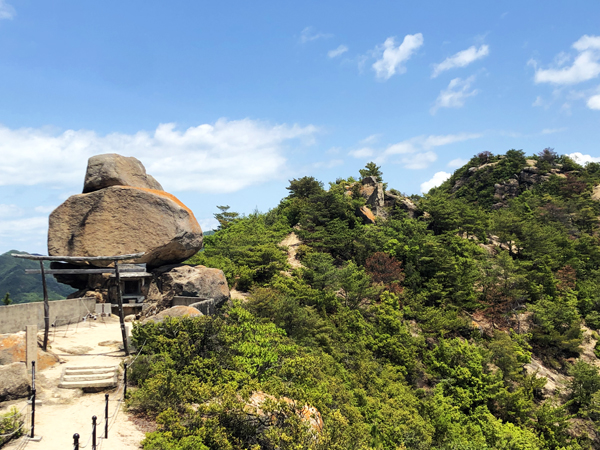 石段の下の小さな駐車場に着いてから、この緊急事態を何とかしなくてはと、色々と考えを巡らす。ネットでスポーツ用品店を探すと、幸運にも1件ヒットしたので、電話を掛けてみるが休みでもないのに出ない。仕方がないのでここは一旦諦めて重岩に向けて長い石段を登って行く、足をガクガクさせながらやっと御堂のある展望台まで来たが、そこからは設置された鎖を持たないと登れない難所が続く。息を切らしながら登った頂上には、見事な重岩が鎮座していた。コバルトブルーの海の向こうには四国や瀬戸大橋まで霞んでみえる。絶景である。