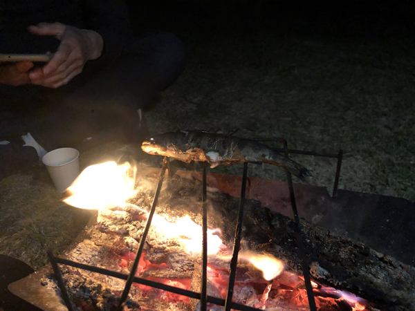 アヒージョをつまみに、今回もクロスカブさんが倉吉のスナックのママさんから貰った大吟醸の4合瓶2本とマルヨシセンターでいつの間にか買った何故か山梨産の白ワインを飲み進める。次はアマゴの塩焼きを食し、酒2本とワインが半分空になった所で、余った食材に水を投入し、スパゲティを煮る。水分が無くなったところでオリーブスパゲティの完成である。