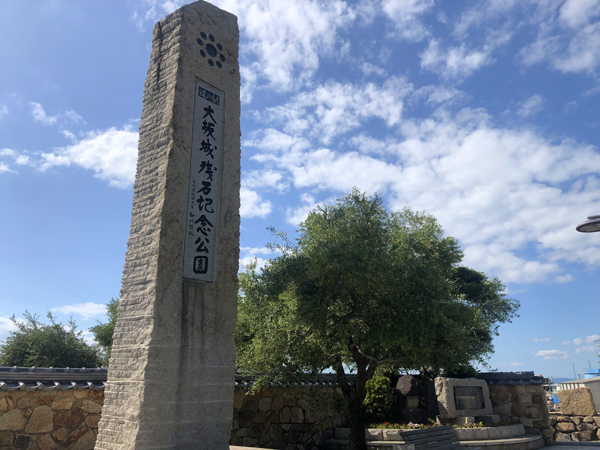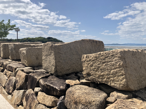 次は最後の見学地大阪城残石記念公園だ。島の北側の県道26号線は海岸線を通る道で、海に浮かぶ小島や本土を眺めなら走れる快走路だ。この公園は道の駅も兼ねており、大阪城築城に用いられた残石が展示されているのだが、無料の資料館もあり、巨石の運搬方法や歴史が具に紹介されている。大阪城大手門の正面にある石垣の巨石は豊島産で、巨石のベスト⒈、2は小豆島産である事が記録で分かった。