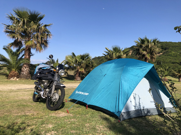 このキャンプ場は県道から海側に進んだ海岸沿いに細長く作られており、綺麗なフラットな芝生にフェニックスやシュロ系の南国植物が植えられ、気分は宮崎のリゾート地のようだ。非常に良く整備されており、ゴミ1つ落ちていない。炊事棟と水洗トイレもあるのだが、管理棟は無く、定期的に管理人が来て受付を済ませるようだ。薪場が無いので宴会用の薪を頼むべく電話をしてみたら、1時間後に持って来ると言うので、テントを設営していたら、姫路からバイクキャンパーが1台やって来た。