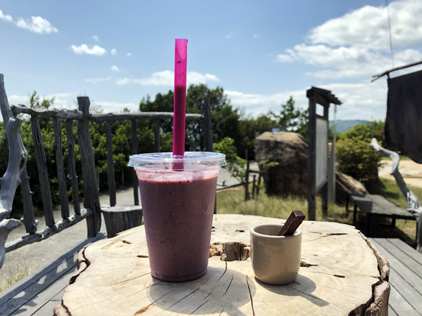 駐車場まで降りると、クロスカブさんがポツリと佇む小さなカフェの女店主と話し込んで、スムージーを注文していたので、仕方なく追加で注文。シュラフを忘れてキャンプに来てしまった話しをしていると、女店主が土庄にホームセンターDCMがあるとの有り難い情報をくれた。