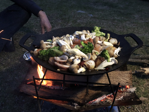 やることは全て終わったので、いよいよお待ちかねの宴会に入る。その前に凍らせて発泡ケースに忍ばせていた缶ビールで乾杯。焚き火台に火を入れて、マルチグリドルを掛け、ニンニク、鷹の爪を入れたオリーブオイルを熱する。熱が入ったところで、イカ、エビ、ホタテ、ブロッコリー、シメジを投入し煮る。何時もの事だが、クロスカブさんは料理が一切出来ないので、傍らで見ているだけで何の役にも立たない。