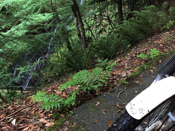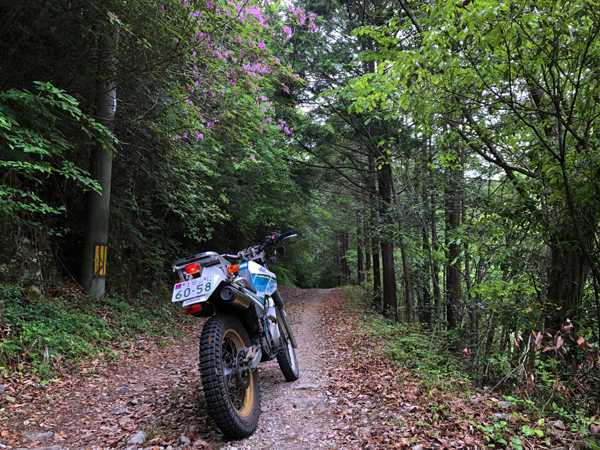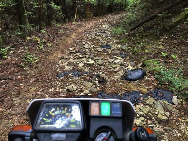 軈て林道は下り坂になり、雨で抉られて凸凹になった路面や倒木なども現れるのでスピードは出せない。フロントタイヤが石や土嚢袋に当たる時にリム付きがあるようなので、少し空気を抜き過ぎたようである。しかし、その分車体が跳ねたりせず、しっかり路面をグリップして安定感は抜群である。