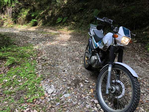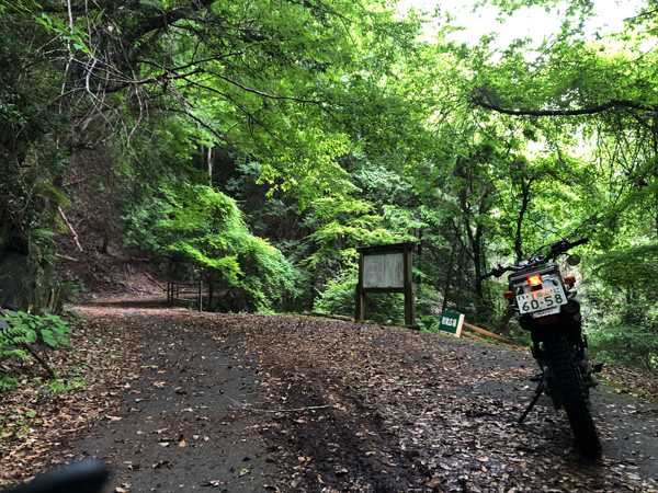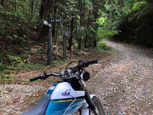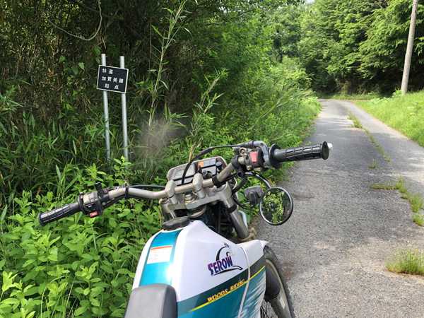 足守から建部を通ってR484に合流した所でスマホナビとインカムを接続し、吉井川まで走る。突き当たりのR374を南下して直ぐの県道90号赤穂佐伯線に入り岡山国際サーキットから八塔寺ふるさと村の入口を過ぎて直ぐに左折し白水方面の山に入って行くと、林道加賀美線起点の看板が現れた。ここで休憩を兼ねてこれからオフロードを走るため、フロントとリアタイヤの空気を抜く。エアーゲージを持って来ていないので、タイヤのサイドを触りながら大体1気圧程度と思われるまで抜いて準備万端だ。