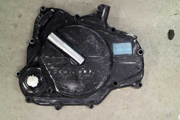 しかし、この小さなバネを交換するにはクラッチカバーを開けなければ交換できない。ギアオイルを抜いて取り付けボルトを全て外し、カバーをプラハンでどつくが、びくともしない。1号機でもてこずった記憶が甦る。仕方が無いのでクランクケースとの合わせ目の小さな突起を探し、マイナスドライバーを当てて加減をしながら叩く。小さな隙間が出来たところで、合わせ面を傷付けないようにスクレーパーを差し込み、ノックピンにはまっているカバーを少しずつ持ち上げて行くと外れた。