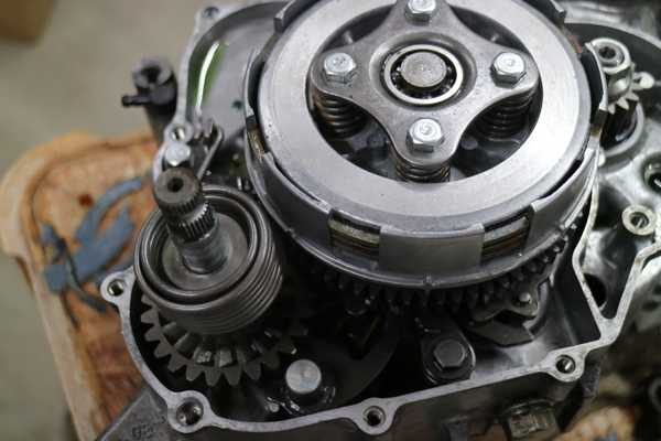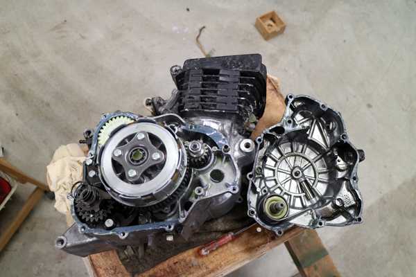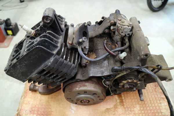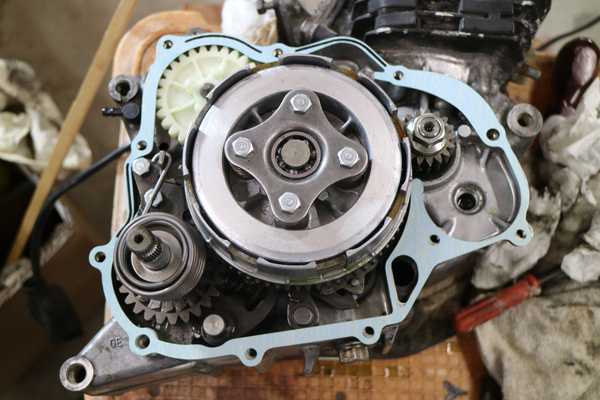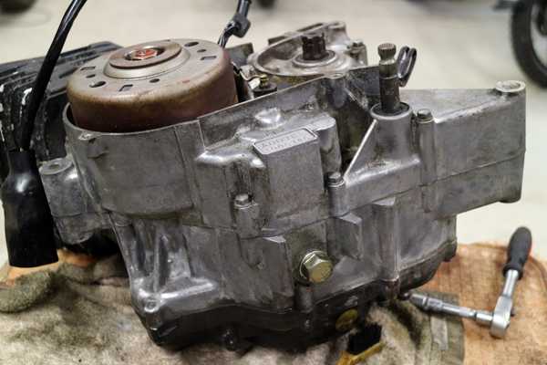 クラッチカバーを外したエンジン(キックスピンドルの備品がカバー側に付いたまま抜けている)
