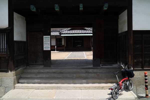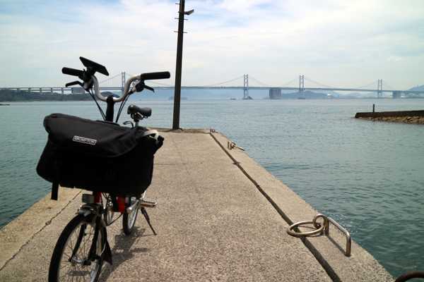 港にはレンタサイクルがあり、一緒だった夫婦は電動自転車1,500円を借りているのを横目に、バッグからブロンプトンを取り出し30秒で組立てて、走行ルートを練る。今日は島を一周するつもりだが、本島港付近での昼食となるため、東側にある塩飽勤番所付近を散策し、再び港に戻り、昼食後西側から右回りで島を一周するルートに決定。専用バッグに折り畳んだ携行バッグや水筒、充電式空気入れなどを入れてフロントに設置して出発だ。