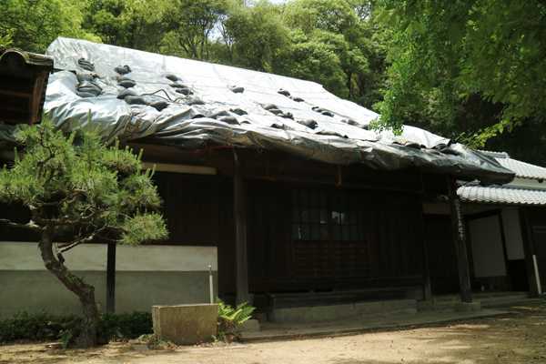 午後からは周囲16kmの島を一周するのだが、周遊道路の総延長はもっと短いと思われるし、船の出港時刻は16時45分なので、時間は余すほどある事から寄り道や休憩しながらのんびりと走る事にする。泊の路地を入って行くと瀬戸内芸術祭の作品として酒屋に丸い看板が設置されていた。どの辺りが芸術なのか良く分からない看板であったが、まぁ芸術なんだろう。直ぐ近くに来迎寺があるので行ってみたら、本堂の屋根には養生シートが被せられ雨漏りの応急処置を施していたが、何年もつ事やら。修復は難しいのだろう。