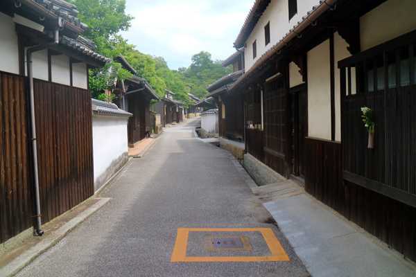 笠島の町並み保存地区(海岸線に並行して弓なりに湾曲するマッチョ通り)