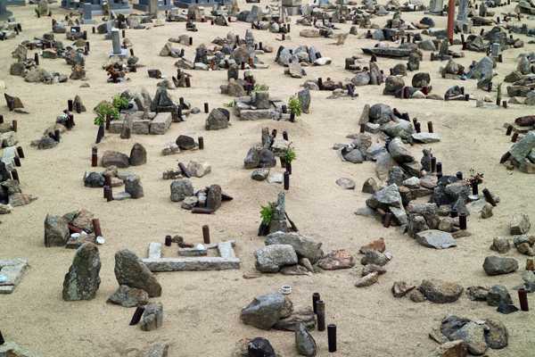町並み保存地区を後にして坂を登ると幸せの鐘がある展望台に着いた。ここからの瀬戸大橋の眺望は素晴らしい。遠く児島の鷲羽山ハイランドまで見渡せる。ここまで来れば坂道はもう無いし、ゴールも近い。新在家海岸まで下って来ると、瀬戸芸で作家と塩飽大工のコラボで作った和洋折衷の家があったので見学。何となく塀の向こうを覗いてみると、無造作な墓地があった。何だろうと思い説明看板を読んでみると、遺体を埋葬するための「埋め墓」と石塔を立てるための「詣り墓」をそれぞれ別の所に設ける事を両墓制と称するが、この墓は「埋め墓」で、民俗学上、貴重な遺構であるとの事である。