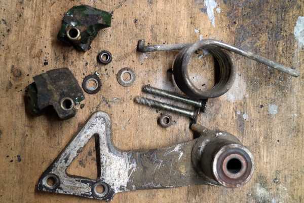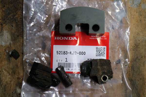少々ガタがあっても走る時は常時チェーンがあたっているので、音が出るような事は無いと思いそのまま取り付ける事にして、チェーンテンショナーの分解に掛かる。テンショナーのガイドは錆が蔓延していたが奇跡的にスプリングは錆びていなかったので、購入しなかった。ガイドをシルバーで塗装し、砕けたスリッパーからカラーを取り出し磨いて置く。スリッパーは新品に交換し、組立てる。