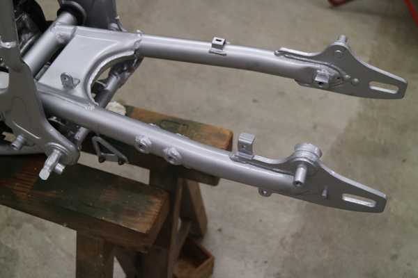 これでスイングアームの取り付け準備ができたので、車体に組み込んで完成である。スイングアームを取り付けた事により、車体のバランスが取れて来てバイクらしくなって来たので、満足である。