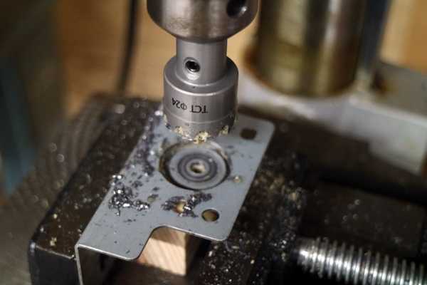 ホールソーをボール盤にセットしてステーに穴開けを行う