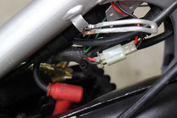 キーシリンダーの配線を接続する配線はタンクの下辺りにあるのだが、汎用なので長さが足りない。仕方が無いので、同色のストック配線とギボシを使って延長、バッテリー(現車ではコンデンサー)に繋がる赤、黒配線はキタコの110型2極カプラを取り付け接続。黒/白と緑はギボシを取り付けCDIとアースに線に接続。これでキーシリンダーの配線は整った。
