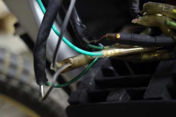 ギボシで接続したCDI用黒/白配線とアース用緑配線