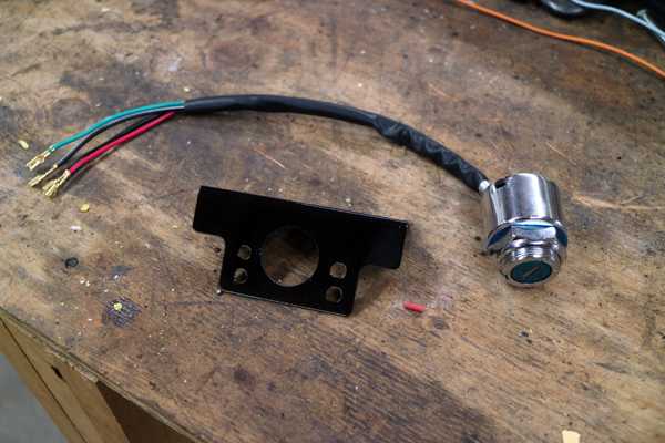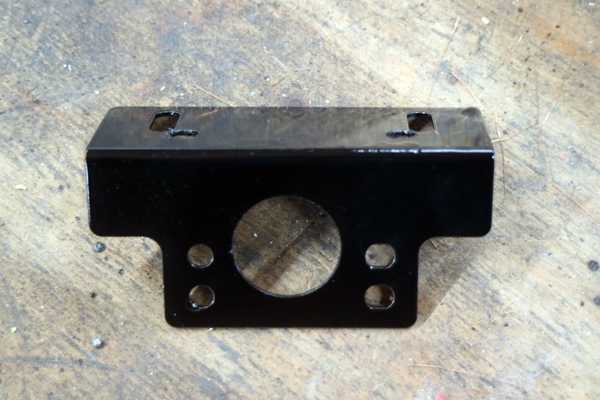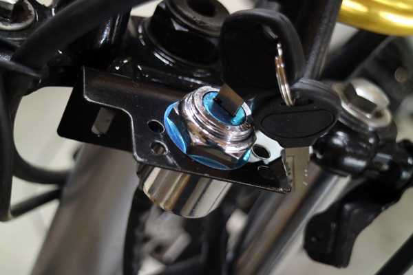 取り付け穴も開けたステーはブラック塗装の上、クリヤーを吹いて、アッパーブラケットに取り付け、キーシリンダーを締め込んだ。当たり前だがピタリと収まった。
