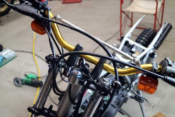 配線処理も行う事にしたのだが、何故か配線が短くメインハーネスにやっと届くといった具合だ。TLR200のハンドルはこのハンドルより長い筈であるので、届かない事はないと思うが現実に余裕はない。ハンドルを左右に一杯まで切ってみても、ケーブルにテンションが掛かるような事はなかったので、取り敢えず取り付け完了とする。