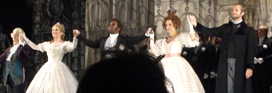 La Cenerentola 12 July 2012 Munich Part2王子の宮殿。ダンディーニはドンマニフィコをワイン係りに任命します。ドン・マニフィコはワインの試飲で酔っ払っている。従者たちも歌う。そうこうするうちに新たな客が来る。アリドーロ先生が現れ、客の登場を告げます。奥から黒いドレスで現れた女性。ベールをかぶっている。皆釘付け。ベールを女性が外した瞬間、美しさに息をのみます。チェネレントラにそっくりな高貴な女性の登場にドン・マニフィコと娘たちはけげんな表情。ダンディーニもこの女性に恋してしまいます。休憩第2幕ドンマニフィコは自分が王妃の父親になったらどうなるか妄想して歌う。芸達者なコルベッリ、すごいです。娘たちは半ば呆れている。王子はダンディーニに告げる。「そろそろ芝居は終わりだ。」ダンディーニは謎の女性に告白する。しかし、「私、好きな方がいるんです」「好きな人?」「ごめんなさいね」「好きな人って…」「あなたの召使ですわ。」ラミーロ王子が喜んで出てくる。ダンデイーニはがっくり。チェネレントラは自分の真の姿を知ってほしいので自分を探してくれと言い、王子に宝石の腕輪の片方をよすがに渡す。チェネレントラが退場し、いよいよ王子のアリア。すばらしかった~!きょうも完璧でした。最高音を長く伸ばすところもなんなくやってのける。すばらしいテノールです。王子はさっさと行ってしまうのでbis はなし。ここはイタリアじゃないので。ダンディーニひとりごちる。「どうせ俺は「元」王子ですよ。」客受ける。ドンマニフィコは、自分の娘のうちどっちにするのかダンディーニに迫る。「パパ、あせらないで」「(娘たちに)パパだって」椅子を1脚持ってくるが王子はドン・マニフィコを座らせない。ドン・マニフィコ中腰のままで苦しそう。王妃の父になったらどんな待遇を望みますか?強欲なドン・マニフィコは豪華な望みを並べ立てる。「私は歩いてどこでも行きますし、食べ物はいつも残り物です」「私はダンディーニ、召使です」ショックを受けて倒れる娘たち。「わかったらさっさと出て行けよ。」「やだ、出て行かない」押し問答の末ぷりぷりになって左右に分かれる2人。ドン・マニフィコの家。チェネレントラがまたあの歌を歌っている。王子が選んだのは真実でした。帰ってくる父と娘たち。3人はチェネレントラに八つ当たりする。雨が降り出し、従者たちが傘に入る。犬を連れて出てくる従者に客受ける。アリドーロも出てくる。雨がやんで出てくる王子とダンディーニ。ドンマニフィコはダンディーニを見て苦々しい表情。王子様に愛想を振りまき「チェネレントラ、椅子をお出ししろ!」チェネレントラはダンディーニが王子だと思っているのでそちらに椅子を運ぶ。「馬鹿!王子はこっちだ。」驚くチェネレントラ。「王子だなんて…」姉妹は散々チェネレントラを馬鹿にする。王子は怒る「彼女と結婚します」笑い出す3人。姉2人は倒れて伸びている。アリドーロ先生が説教する。泣き出しながら歩いて去る姉妹に客大受け。宮殿チェネレントラが純白のウェディングドレスで登場。彼女は義父と義姉を許すのが復讐ですと歌う。父親は謝るが、姉2人はまだ素直になれない。ここからはチェネレントラの独壇場。すばらしいアジリタを披露するディドナート、不調の影すら見えない。最後に記念写真。大団円。カーテンコールでまた客が大熱狂。ドイツのお客さんは日本人と似ていて、途中クールですけど終わると熱いです!本日もプロ中のプロたちの名演ありがとうございました。