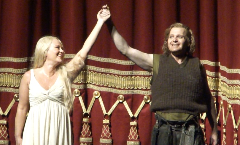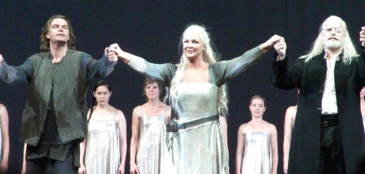 Lance Ryan as Siegfried in Munich Part2ミーメが出てきて、ジークフリートの脱ぎ捨てたファフナーの赤いコートを探る。リングを探しているのだ。アルベリヒも出てくる。すばらしい歌手2人の対決でここも個人的にうれしい。みっともなく口げんかする兄弟。血を分けた弟の姿を口汚くこきおろすアルベリヒ。急にいやになったミーメはコートをぱっと放す。2人の兄弟の関係が演技しつくされている。おい、出て来たぞ!くそ!指輪も持っている!悔しがるアルベリヒ。小鳥がジークフリートに忠告する。ミーメとジークフリートのやりとりをじっと見ている金網の上のアルベリヒ。どんどん手前に移動してくる。ジークフリートは怒りにまかせてミーメののどをノートゥンクでかききる。同時にアルベリヒの哄笑。ジークフリートと小鳥は舞台のしもてにミーメを運ぶ。足だけ突き出している。小鳥からブリュンヒルデのことをきかされるジークフリート。小鳥を愛撫するジークフリート。まるでこの2人も恋しあっているみたい。第2幕了。第2幕もものすごくおもしろかった(アルベリヒとミーメの演技がすごいし、ファフナーの演出がすばらしかった)感動で大興奮状態。第3幕エルダを呼び出すさすらい人。人々の中からわいてくる白塗りのエルダ。ここの歌唱もすばらしいTJマイヤー。ジークフリートが来る。ヴォータンは小鳥を追い払う。ジークフリートがヴォータンの槍を叩くと槍が折れ、そのひとつがオケピにすごい音を立てて落っこちる。これはアクシデント。(笑ヴォータンは残ったほうの槍を拾うと去っていく。いよいよ。人々が川のように集まっている。巨大なサランラップをかけた状態。これが燃える山なのか。やがてサランラップがはずれて、人々の集団。その真ん中になにやら白い物体が。おおいをはずされると舞台の奥に向かって頭を置いて寝ているブリュンヒルデ。ここからのランスの演技もすばらしかった。逡巡しながらキス。ブリュンヒルデが起き上がるといったんジークフリートはいなくなる。Heilここのシーンがもうまさに大感動。歌がすごいし、このブリュンヒルデ、ものすごくなまめかしく、色っぽい。美人です、ネーグルスタッド。胸もすごい。これじゃあ惚れちゃうよなという。燃え尽きたローゲの火の輪がいなくなり、舞台にはベッドが運ばれ、赤い布で舞台全体が覆われる。これがまた視覚的に美しい。ブリュンヒルデが悩んでいる間もジークフリート赤い布の裾をきれいにしたりしている(笑)ジークフリート牧歌のメロディが出てきたところで最高潮に盛り上がる。2人の愛が燃え上がる。全幕了カーテンコールに出てきたのは第3幕の登場人物だけだった。客の熱狂振りは今夜もすさまじかった。足を踏み鳴らす音。主役の2人に惜しみない賞賛が送られた。ネーグルスタッドとライアン、新しいスターの誕生だ。こうやって時代は動いていく。来年以降どうなっていくのかな。バイロイト含め。