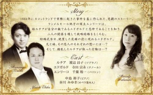 Tokyo Operatic A'la Carte Vol.3Donizetti: Lucia di Lammermoor Highlight28 Sep.2012at PASONA hall, Otemachi, TokyoMasako Watanabe (soprano)Munenaga Terada (tenor)Yuichi Chiba (baritone)***ランメルモールのルチア ハイライト at パソナTokyo Operatic A'la Carte Vol.32012年9月28日東京・大手町パソナグループ本社ビル B1ホールルチーア 渡辺昌子 エドガルド 寺田宗永 エンリーコ 千葉裕一中島裕子(pf) 谷川みゆき(オペラ案内人)*** いや~縁って不思議なものですね。きょうは寺田宗永さんがエドガルドを歌った「ランメルモールのルチア」のハイライト公演に伺わせていただきました。そもそも寺田さんを知ったのは、6月に紀尾井町であった星野さんの「ナブッコ」の公演でです。少しの出演でしたがすばらしかったのでぜひまた大きな役で聴いてみたいと思っていたのです。そしたらルチアのエドガルドをやるというのでラッキーに聴くことができました!いや~二期会ってどんだけ層が厚いんでしょう。きょうのソリスト3人とも二期会です。寺田さんはすごく大声量のテノールです。まだ38歳。こんなにパワフルとは予想してませんでした。私が思い出したのはMETで聴いたヴィットリオ・グリゴーロです。彼も細いくせにものすごいでか声なんです。いや~驚きました。そしてバリトンのエンリーコを歌った千葉裕一さん。これがまたびっくりでした。彼の声はマリウシュ・クフィエチェンとディミトリ・フォロストフスキーを足して二で割ったような声でした。すばらしい逸材です!まだものすごく若いです。多分31~33歳ぐらい?とにかくいい声!2人の二重唱と3人で歌ったセクステット、もうしびれました~2人ともこの100人程度しか入らないホールにはでか声すぎでしょ(笑)ルチアの渡辺昌子さんもすばらしいルチアでした。美しく細やかで感情が入っていました。第一部「旅立ち」歌の合間にアナウンサーの解説が入ります。第1幕ルチアのアリア「あたりは沈黙に閉ざされ」ルチアが亡霊の伝説への恐怖を歌い、一転して恋心を歌う。エドガルドがやってくる。ちゃんと演技付きなんですよ~伴奏はピアノですけど。ごめん遅くなってルチアとエドガルドの二重唱エンリーコへの怒りを歌い結婚指輪をかざして愛を誓うもう行かなくてはと言うエドガルドにルチアが歌いVerranno a te sull'aurei miei sospiri ardenti--美しい二重唱になるspargi un'amara lagrimasu quest pegno allor***第2部 結婚証明書ルチアとエンリーコの二重唱さあ、いよいよバリトンの登場だ!と期待高まる私(バリトン、バス・バリ大好き~)ルチアが入ってくる。おいで、ルチア。口をきかんのか?ルチアの怒りの歌唱Il pallor, funesto, orrendo,---お兄様のなさったことったらひどいわ!おまえが馬鹿げた恋に狂ってたんだから当たり前だでももう終わったことはいい。私はおまえの兄だ。もう怒ってない。だからお前も馬鹿げた恋はあきらめるんだ。ちゃんとした相手を(見つけてある)…なんですって!私はもう結婚の誓いをしたのよ!spegni tu l'insano amor!偽の手紙を渡す。手紙を見るあぁ!Soffriva nel pianto ---Un folle ti accese ---美しい二重唱エンリーコは自分の一族を救うことができるのは金持ちの貴族アルトゥーロだけとルチアに迫る。エンリーコは怒りの歌唱。Se tradirmi tu potrai, ---お前が裏切ったら私は終わりだ亡霊になってお前を血まみれで呪ってやるからなここのスピード、ピアノが速いテンポで入りますが、バリトンはゆっくり歌いたがります。ルチアも同様にゆっくり歌ってました。そしてついにあの場面です。セクステット!(六重唱)ライモンドとアリーサとアルトゥーロがいないので三重唱だったのですが、本当にすばらしかったです。Chi mi frena in tal momento ---最初まずテノールとバリトンの二重唱から入るんですが、もうこの入りでうわ~となりました。すばらしい!美しい!ぴったりあってるし、2人の声がすばらしい!そこにルチアが加わる。ああ、これなのよ~これが聴きたかった!なぜ来たんだ?運命だ。この野郎(Sciagurato! シャグラート)エドガルドは結婚契約書を見て驚愕する君が書いたのか?答えるんだ!(Rispondi!ルチア Si…エドガルド:Maledetto!君と愛を誓ったあの時が呪われるといい君たち一族に近づくべきじゃなかったvi disperda寺田さん、高音を伸ばしながらさらに半音上げるところも完璧すばらしい!ブラヴォーと叫びたいぐらいでした。本当にこのシーンすごかったです。ここで休憩第2幕タワー・シーン Wolferagエドガルドとエンリーコの二重唱大好きなシーンです最初エドガルド。馬のひづめの音誰だ?とにかく寺田さんのテンションがすごい。入り込んでる俺だ。rispondeva al mio furor!そこで…覚悟するんだな!そこで…お前を殺してやるIvi t'uccidero~~~そして待ってました。二重唱すばらしい!ルチアの狂乱の場エドガルド、私は戻ってきたのよ…Alfin son tua, alfin sei mioエドガルドとの婚礼を妄想で歌う。亡霊が出てきたわ!エドガルドここに隠れましょう!祭壇の下よ笑顔になる私たちのための結婚の音楽が聞こえるわ!ルチアフルートと歌うシーン、きょうはピアノと歌