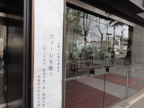 フォーレを歌う会特別演奏会2013年3月24日(日)武蔵野市民文化会館 小ホール第1部ラシーヌの雅歌(オルガン独奏)夢のあとに(女声合唱)リディア(男声合唱)パヴァーヌ(混声合唱)パピヨン(チェロ独奏)エレジー(チェロ独奏)第2部死者のためのミサ曲指揮:小津準策ソプラノ:森川郁子バス:狩野賢一オルガン:浅尾直子チェロ:高城晶一ピアノ:山口真未合唱:フォーレを歌う会三鷹まで行ってきました。桜が満開で陶然となりました。いろいろ盛り沢山で楽しめました。チェロのエレジーにしびれました。フォーレのレクイエムは名曲です。バリトンの音域なのでバスバリの狩野さん的には本意ではなかったかもしれませんが、高い音域も美しくパワフルで、ホールを酔わせました。異次元の世界でした。武蔵野市民会館小ホールには初めて足を踏み入れました。パイプオルガンつきの、まるで教会みたいな、宗教曲にはぴったりの会場です。音響もすばらしく大満足でした。狩野さんのような美声の歌手には非常に音響が重要です。響き渡って一種異次元に連れて行かれる感じを味わいました。第1部オルガン演奏、女声合唱、男声合唱、混声合唱、そしてチェロ独奏といろいろ多岐にわたっていて楽しめました。特にチェロ!すばらしかったです。フォーレの世界を堪能しました。冒頭、指揮者の小津準策さんからフォーレについての説明がありました。男声合唱に、年配の方なのですが非常に美しい高い声のテノールがいてびっくりでした。素人さんとはとても思えない声でした。その方はレクイエムではセンターの1列目でした。パヴァーヌは不思議な曲で男女の会話になっています。おもしろかったです。しかし女声にはやや低い音域で大変だったかもしれません。この合唱団素人さんとしては男声合唱はなかなかでした。パヴァーヌが終わったらさきほどの人とは違う、めっちゃトークの下手なMCが出てきてフォーレについて詳しく解説してくれました。するとその方はなんとチェロ奏者だったのです!高城晶一さんすばらしかったです。1曲目は運指の練習のようなパピヨン。おお~あのしゃべりに比べてこの指の饒舌さはなに?と思っていたら次のエレジーでやられました!チェロのリサイタルはマリオ・ブルネロに2回行ったぐらいなのですけど思いだしました!すばらしい響きチェリストは入りこんで弾いていましたBravo!でした。またぜひ演奏を聴いてみたいです。第2部いよいよレクイエムです。I. Introït et Kyrie (Ré mineur) II. Offertoire (Si mineur) III. Sanctus (Mi bémol majeur) IV. Pie Jesu (Si bémol majeur) V. Agnus Dei et Lux Aeterna (Fa majeur) VI. Libera me (Ré mineur) VII. In Paradisum (Ré majeur)伴奏はパイプオルガンです!なんて豪華なことでしょう。I. Introït et Kyrie (Ré mineur)合唱。レクイエムドンナエーイスドミネーキリエ・エレイゾンクリステ・エレイゾンII. Offertoire (Si mineur)合唱がアカペラで入る伴奏が入りまたアカペラで歌う。そしていよいよバリトン・ソリストの登場です。ホスティアーーーーース美声がホールに響き渡ります。めっちゃいい音響でした。高い音域に終始している曲です。長く長く美しいビロードのような声を伸ばしますパワー全開の時にはホールが震えます残響がすばらしいです狩野さんの超低い音を聴けないのは残念でしたがフォーレがこう書いたので仕方ありません(笑狩野さんの声は宗教曲にぴったりです!III. Sanctus (Mi bémol majeur)IV. Pie Jesu (Si bémol majeur)ソプラノの登場です!この方は三軒茶屋のバロックのコンサートで一度聴かせていただいた方です。森川郁子さん。背が高く美人で、美しい声ですV. Agnus Dei et Lux Aeterna ハモリ部分が美しかったです。VI. Libera me いよいよリベラ・メです。まず合唱から入りますバリトンソリストが歌い出します。ここは低い入りですパワフルに歌います名曲なので酔いますホール中に響き渡りました。合唱にまた戻り最後にソリストと合唱が歌います。狩野さんの声は宗教曲にピッタリの「審判者の響き」、声の怖ろしさも持ち合わせていますバスは、悪魔とか王様とか神様の役ばっかりですから非常に合っています♪VII. In Paradisum お疲れさまでした~~!!カーテンコールでさっさと指揮者が出て行ってしまい皆さんきょとんとしてましたが指揮者戻ってきて盛大に大喝采でした。