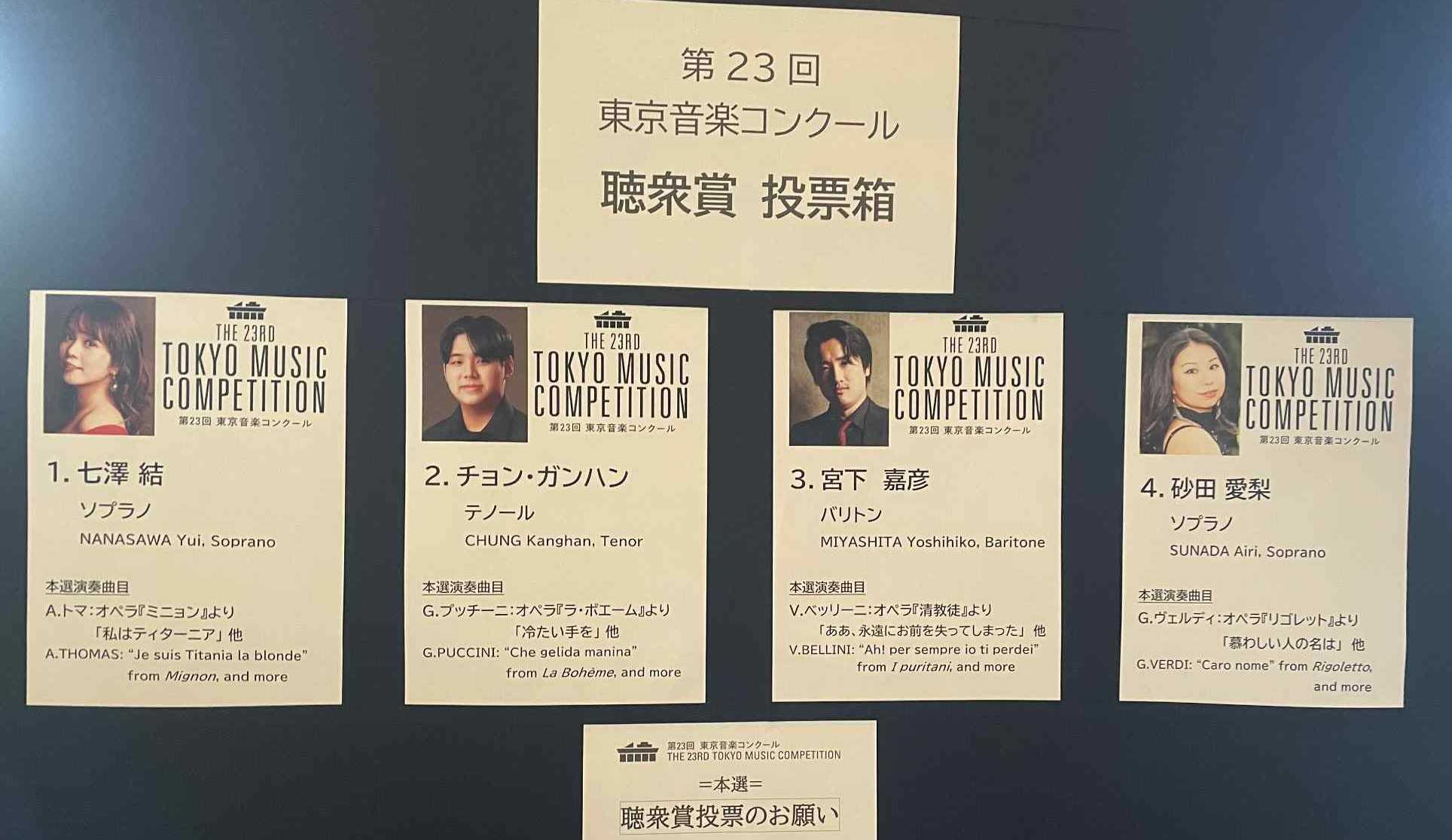 第91回日本音楽コンクール 声楽部門第2予選(歌曲)2022年9月7日トッパンホール【第2予選通過者】益田 早織 小池 優介 種谷 典子 深瀬 廉 一條 翠葉 松原 みなみ 程 音聡(文中敬称略)※演奏順21名→7名第2予選は皆さん大変レヴェルが高かったです。この熱戦の模様は、2022年10月18日(火)午前7:25~9:15にNHK-FMで放送予定とのことです。***39 久保 法之(カウンターテノール)1課題曲 プーランク(仏語) Priez pour paix2自由曲 Lekeu(独語) 透明で力強い大天使のごときお声45 的場 正剛(バリトン)1自由曲 ラフマニノフ(露語)2課題曲 ラヴェル(仏語) ドラマチックバリトン。会場を満たす豊かな響き。 ラフマニノフは有名曲。とてもいい曲です。 ピアノは篠宮久徳51 佐藤 瞳(ソプラノ)1課題曲 フォーレ(仏語) 2自由曲 J.マルクス(独語) リリック・ソプラノ。美女の上に美声。ワンショルダーの美しいドレス。すばらしい表現力。J.マルクスは曲の盛り上がりがすごい。 ピアニストがめちゃうまい眼鏡の男性。→井出 德彦さんでした。 今日は鍵盤がよく見える席にしたので臨場感抜群ですわ。57 益田 早織(メゾ・ソプラノ)☆第二予選通過1自由曲 ドボルジャーク(チェコ語)2課題曲 リムスキー=コルサコフ(露語) ドラマチックメゾ。パワフル。ドボルジャークが泣かせる表現力。リムスキー=コルサコフは珍しく、聴けて嬉しい。64 秋本 悠希(メゾ・ソプラノ)1課題曲 クィルター Fair House of Joy 2自由曲 F.ブリッジ Love went a riding 選曲が英語ダブルになってしまった。 リリック・メゾ、スピント気味に歌う。ブリッジは迫力の歌唱! ピアニストはまたあの超劇的に盛り上げて弾く眼鏡の男性。いったい誰⁉→井出 德彦さんでした。69 今井 実希(ソプラノ)1課題曲 中田喜直♪髪 2自由曲 林光♪誰が灯りを消すのだろう 選曲が日本語ダブルになってしまった。しかし彼女の表現力は日本語歌曲でとても生きていた。中田喜直でも表現力。勝負曲の林光に至ってはぞっとするほどの物語性に引き込まれる。怪奇小説を読んでいるような…。意味がダイレクトに伝わるのでこれこそが歌曲のコンペをする意味なのではないかと実感した。見事な構成力、表現力。 71 島内 菜々子(ソプラノ)1自由曲 リスト Oh! quand je dors(仏語)2課題曲 ドビュッシー(仏語) 選曲が仏語ダブルになってしまった。ノーブルな美声のリリックソプラノ。表現力がすごい。 伴奏ピアニストが篠宮久徳さん。《休憩》72 佐々木 美歌(ソプラノ)1課題曲 リムスキー=コルサコフ(露語)2自由曲 三木稔 寒椿 ノーブルな美声のリリックソプラノ。寒椿は迫力。81 七澤 結(ソプラノ)1課題曲 R.シュトラウス(独語)2自由曲 Bouranger(仏語) リリック・コロラトゥーラ・ソプラノ。黒のマーメイドドレス。R.シュトラウスは愛らしく。Bourangerは強い声でレガート。84 櫻井 愛子(ソプラノ)1課題曲 シューベルト♪ガニュメート(独語)2自由曲 マーラー♪Sheiden und Meiden(独語) 選曲がドイツ語ダブルになってしまった。リリコ・レッジェーロ・ソプラノ。胸に大きなリボンのついたピンクのドレス。ガニュメート、初々しく喜びを歌う。マーラー表現力豊か。4 小池 優介(バリトン 東京藝術大学) ◎☆第二予選通過1課題曲 クィルター(英語)2自由曲 Loewe(独語) バスかバスバリと思ったほど深くていい声~!Loeweすばらしい表現力。Wagner歌ってほしい。 ピアニストは、居福健太郎さん。うまい。上手すぎワロタ17 内 夏美(ソプラノ)1課題曲 プーランク(仏語)2自由曲 小林秀雄 アンニュイな美声。メゾかとも思わせる、ドラマティックコロラトゥーラだろうか?森谷真理さんに歌い方が似ている。小林秀雄はオペラティックで強靭な声。すごい!声が奔流のよう。19 田井 友香(ソプラノ)1課題曲 ドビュッシー(仏語)2自由曲 リスト♪ローレライ(独語) リリック・ソプラノ。優しい表情。ローレライ、高音が美しい。激情ほとばしる部分はスピント気味の伸ばし。22 種谷 典子(ソプラノ)☆第二予選通過1自由曲 カゼッラ(伊語)Alfredo Casella - Fuor de la bella gaiba2課題曲 山田耕筰 南天の花 カゼッラ、圧倒的な表現力。高音が一点の曇りもなく美しい。音程の遷移も見事。山田耕筰 南天の花は鳥肌。すごい表現力。デュナーミク、すごいピアニッシモ。 28 森 翔梧(バリトン)1課題曲 團伊玖磨 秋の野2自由曲 ロッシーニ(伊語)Rossini: L' ultimo ricordo 豊かなリリック・バリトン。團伊玖磨はクレッシェンドしていく歌い方。ロッシーニは感情込めている。31 岡村 彬子(メゾ・ソプラノ)1課題曲 デュパルク 悲しい歌(仏語)2自由曲 プーランク(仏語) 歌い順は推測。選曲がフランス語ダブルになってしまった。美声に聞き惚れました~。32 深瀬 廉(バリトン Universität der Künste Berlin)☆第二予選通過1課題曲 ラヴェル(仏語)2自由曲 シューベルト Zwerg(独語) 明るい声のリリック・バリトン。シューベルトは演技もすごい。高い声から低い声まで出ます。 ピアニストはまたあのうまい方。痩せた方で眼鏡。→井出 德彦さんでした。33 小林 美咲(ソプラノ)1自由曲 ドビュッシー(仏語)2課題曲 R.シュトラウス(