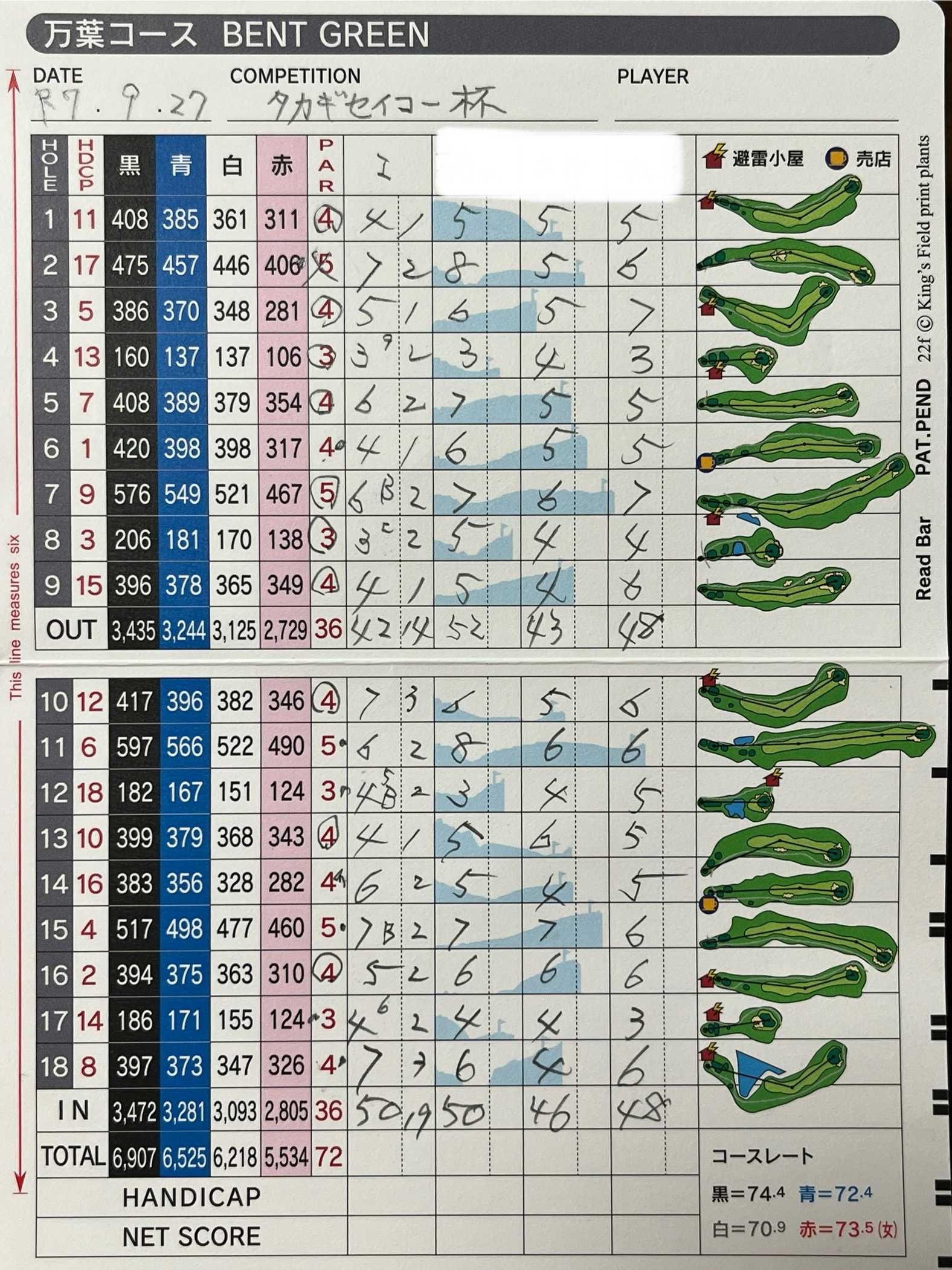 Wペリアのオープンコンペ。ダボ以上は3ホールしか引っ掛からず、数少ないパーが4ホールも引っ掛かるという哀しい結果に…。