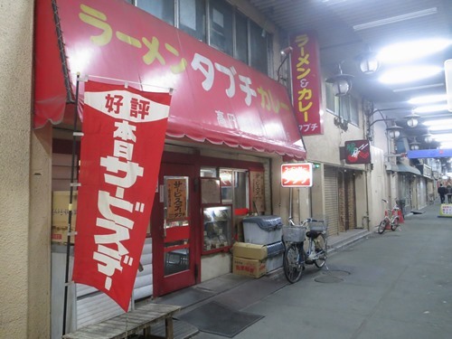 今日は荻窪、阿佐ヶ谷とお客様を順々に訪問。16時頃に高円寺まで戻りました。昼を食べそびれているのでお腹ペコペコです。客先にチャリを置かせてもらってガード下を駅方向に行ってみました。本日の目的地はこちらです(この上を中央線の電車が走っているんですよ)「好評 本日サービスデー」の旗。そう、毎月8日はタブチ高円寺店さんのサービスデーなんです。さてさて。何にしようかな・・・ああ、このサンプルじゃあ判らない(笑) つうかこれ、、、役に立っているのか?お正月明け、野菜を多めに食べておこうかな。券売機の上段に鳥野菜フライ定食のボタンあり。お値段は500円です。チキンに野菜か~ むう、いいかも。お店に入り奥さん(?)に食券を渡して席へ。すぐに自分の分だけで調理に取り掛かってもらえました。お、きたきた~あああ、なんというカツ満載的な鳥野菜フライ(この写真のみクリックで拡大)食券先買いのため配膳時にサービスデーの割引券も貰えます。この写真では重なって写っておりますが定食類用、カレー類用、めん類用の3枚、いずれも100円引き券です。てんこ盛りのフライを接写。良い揚げ具合です。チョイ掛けソースは自分がかけたものですよ。うまく色が出ておりませんがフライの下にはキャベツがこんもり。野菜フライはカボチャふた切れ、ナスひと切かな。これ、実態は限りなくチキンカツだよね。ご飯も十分にボリュームあるのですがおかずの量があり過ぎ(苦笑)見事におかずが余ってしましました。ご飯お代わりしようか。でもなあ、このフライだけでもかなりヘビーなんだよなあ。結局オカズのみをモグモグ食べます。揚げたてなので擬音は「サクサク」かな。店内はこんな感じ。これ、厨房側ではありませんよ。フロアの壁ですからね。むう、「食べログで話題のお店」のステッカー発見!確かにある意味で「話題の店」ですわ、ここ。奥のテーブルではこの店の子供がノートを広げて勉強しております。そしてお客さんへの配膳が終わった後、奥さんもそのテーブルで食事をし始めました。なんだか親戚の家に来たみたいな感じがしてきちゃった。オレ、泊まっていこうかな(笑)にほんブログ村にほんブログ村にほんブログ村
