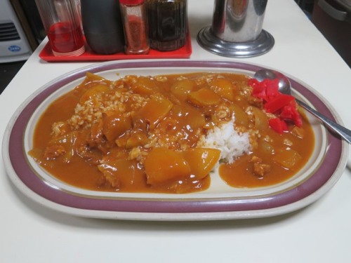 今日のラストは高円寺のお客さん、それが終わったらそのまま家へ、という予定です。ただし次の客先では少々時間がかかりそう。先に夕食を済ませておくことにします。再び中央線ガード下のタブチさんへ。今日はサービスデーではないので旗はなし。時間もありませんので最初からカレーの一択です。こちらの店の看板は「ラーメン&カレー」となっておりますし。そもそも中野のタブチさんもカレー推しですからね。あと今日はこの100円割引券を大盛券として使いますよ。前回貰った3枚のうちの1枚です。※この地図、北が下になっているので来る人は要注意。お店の場所は阿佐ヶ谷方向ですからね。平日の17時前、店は空いていてすぐに盛り付けてもらえました。カレー大盛(クリックで拡大)あああ、皿でかっ。本当に大盛りだな(まあ大盛り頼んだんですけど)前回、1月8日の鳥野菜フライ定食ではご飯を早々に食べてしまいました。でもあれはご飯が少なかったわけじゃない、おかずが多すぎただけだったんだわ。自分は量を食べる方です。食べ切ることはできそう。でもまだ仕事が残っていて時間があまりありません。幸いカレーの味はマイルドタイプ。ルーをたっぷり使ってご飯をどんどん口に運びます。後半はソースをかけて味を変えて。400円のカレーではありますがご覧のとおり、タマネギ、ジャガイモがたくさん入っております。肉もちらほら。ふう、なんとかペースを落とさずに食べ切りました。多分お店に入ってから食べ終わるまで10分かかっていないはず。御馳走様でした。さあ、お腹もいっぱいになったところでもう一仕事です。にほんブログ村にほんブログ村にほんブログ村