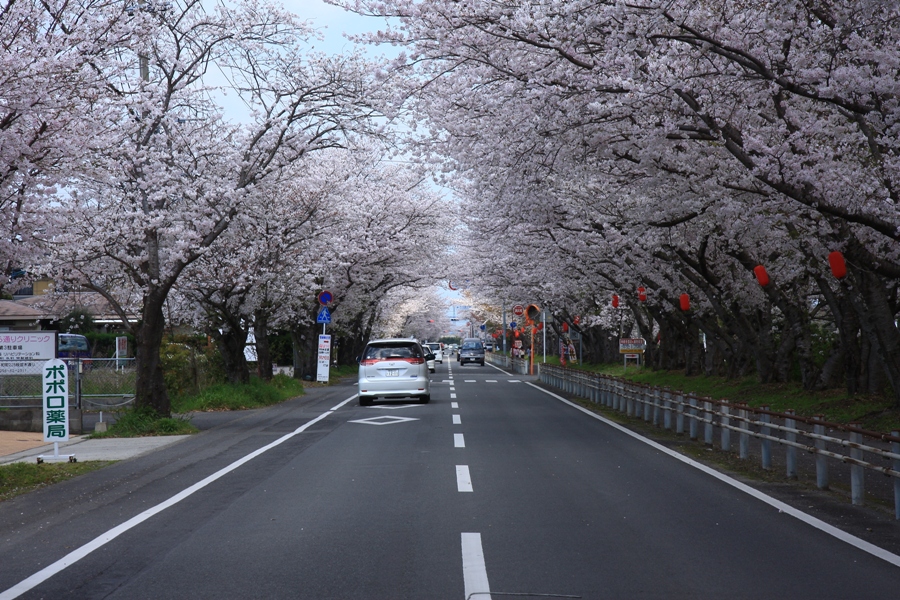 ♪貴様と俺とは同期の桜♪昭和20年まで海軍の訓練飛行場があったところが平和公園になり,30年前桜が植えられた。車の流れが切れたところを見計らって道路の真ん中で撮影。