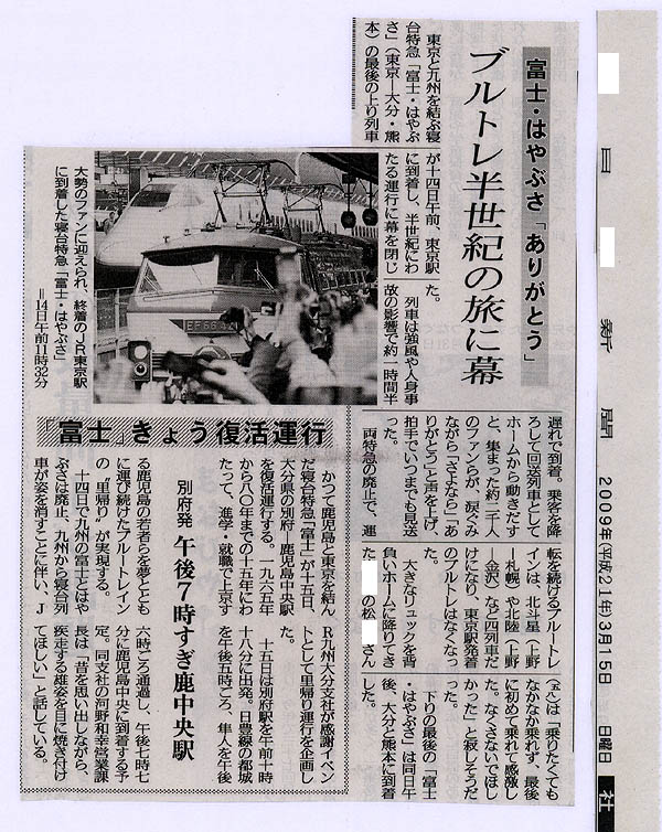 ラストランの新聞記事,「根掘り葉掘り尋ねられて,たったこれだけかい!」,アハハ。3年前はやぶさで東京に行こうとしたら,集中豪雨で新幹線・おれんじ鉄道ともに不通になって乗れなかったことや,ブルートレインへのねぎらいの言葉など・・・。一応,市名と氏名は一部伏字にしました。ご存知の方は当てはめて読んでくださいね。また,ご存知の方はばらさないでくださいね。