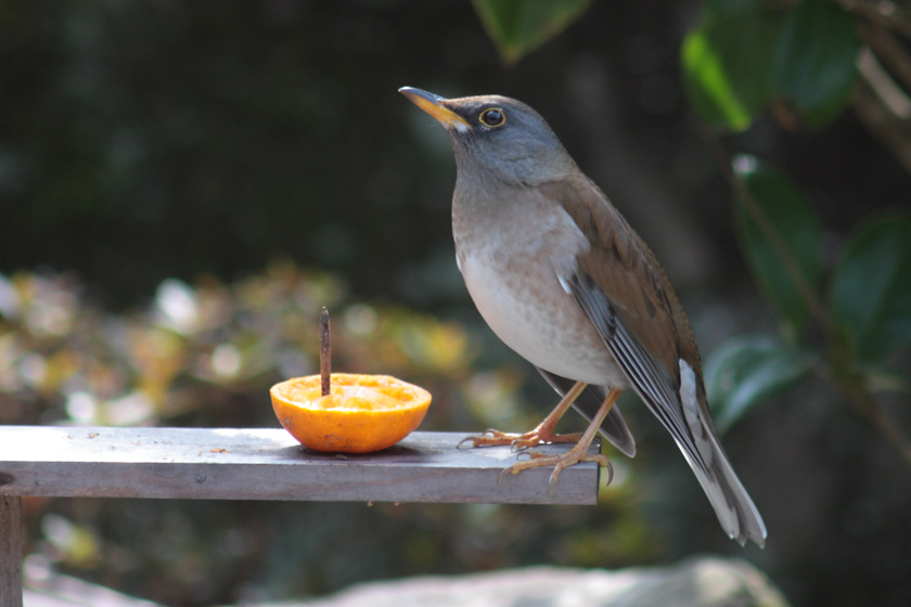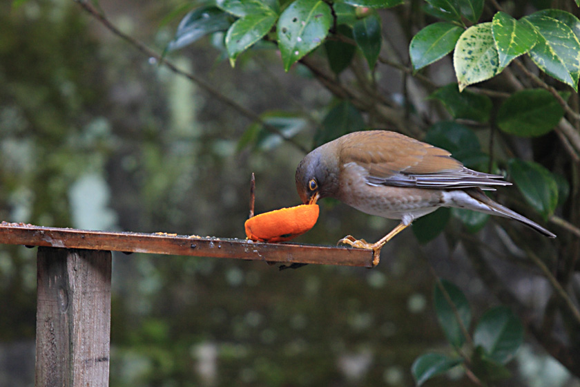 シロハラ君は,嘴でミカンを掴んだまま引っ張ったり,持ち上げたりして落としてしまいます。「もうちった,美味いミカンを食わせろ」の意思表示なのか,それとも地面に落として独占しようと考えているのかは,わかりません。今朝もこの後すぐに落としてしまいました。